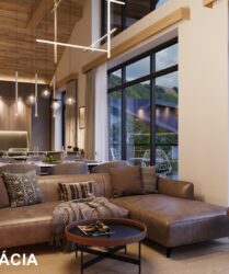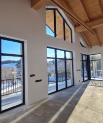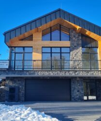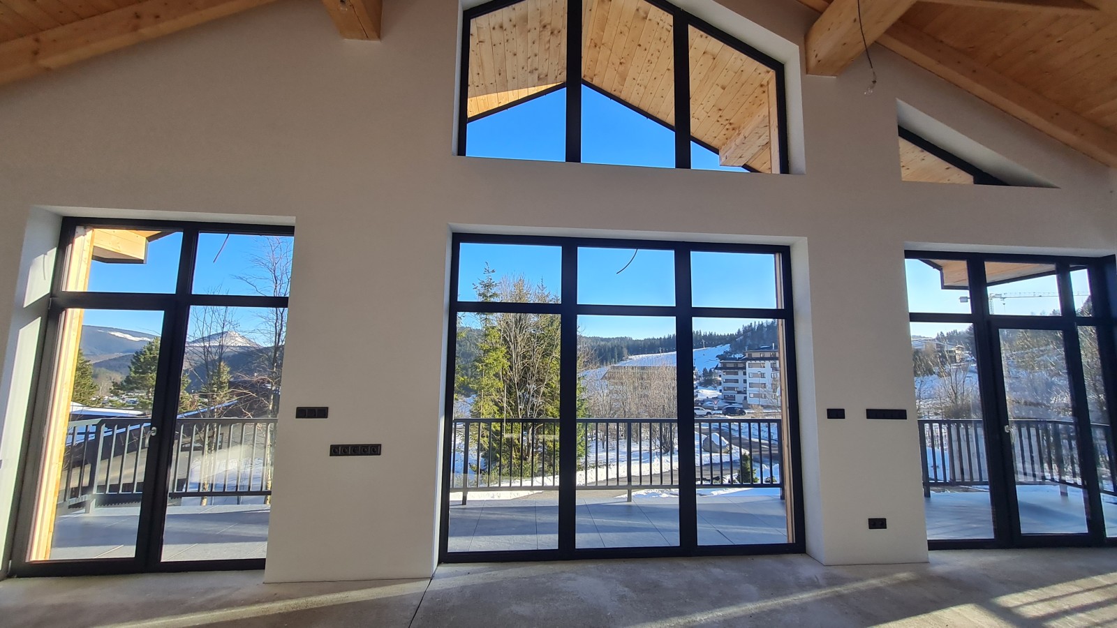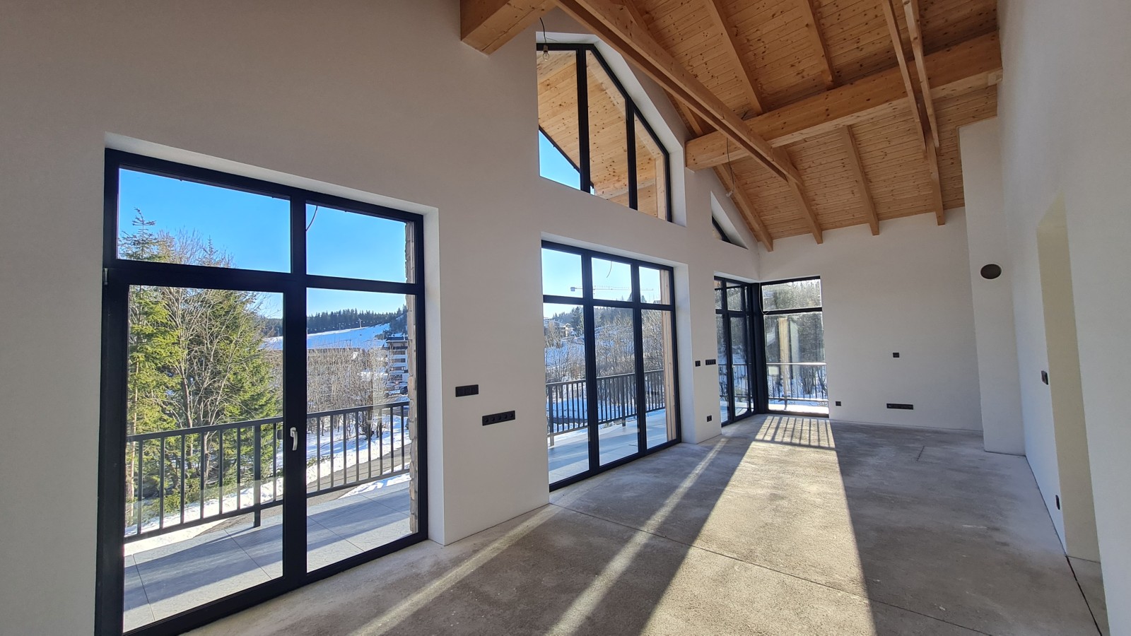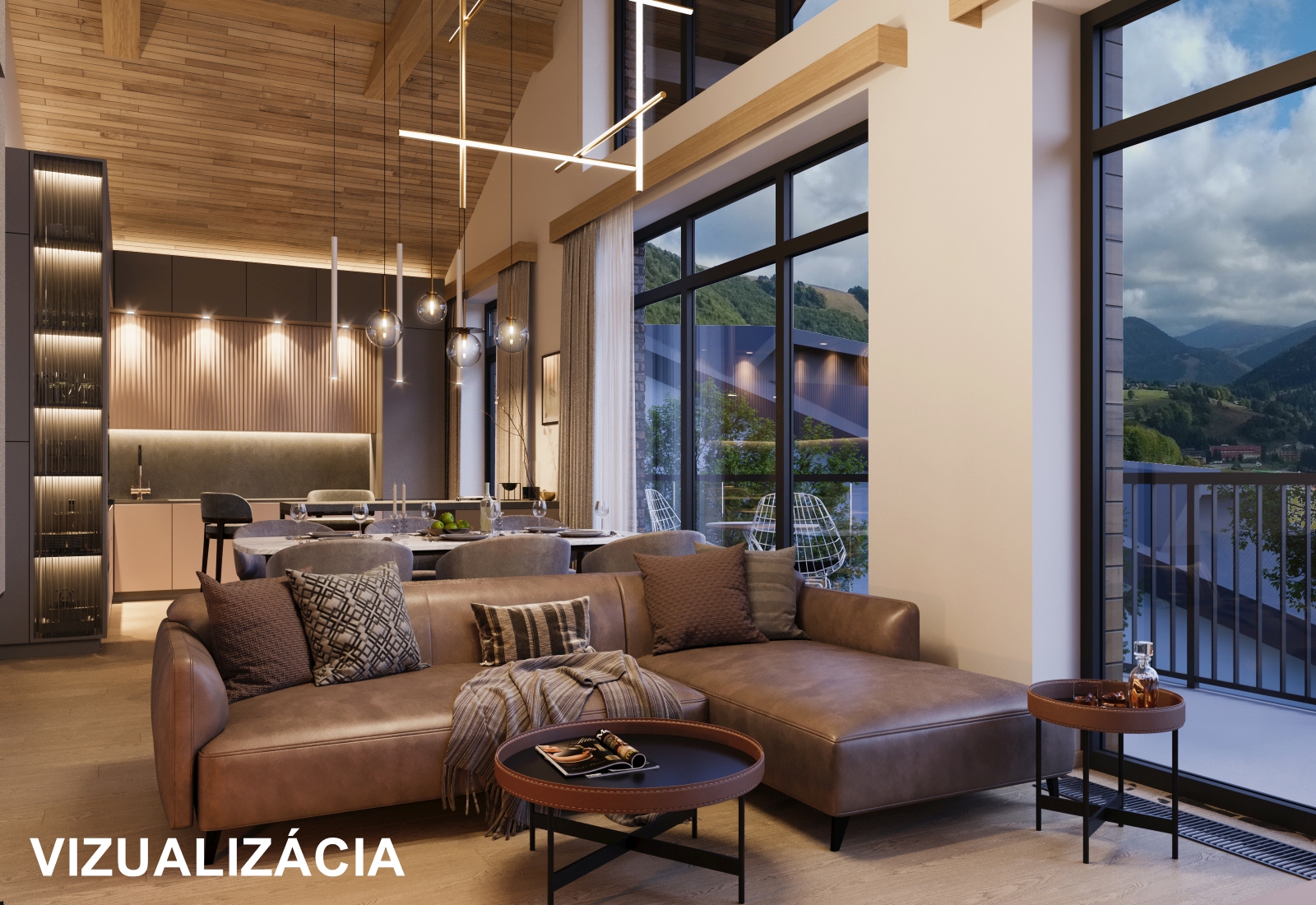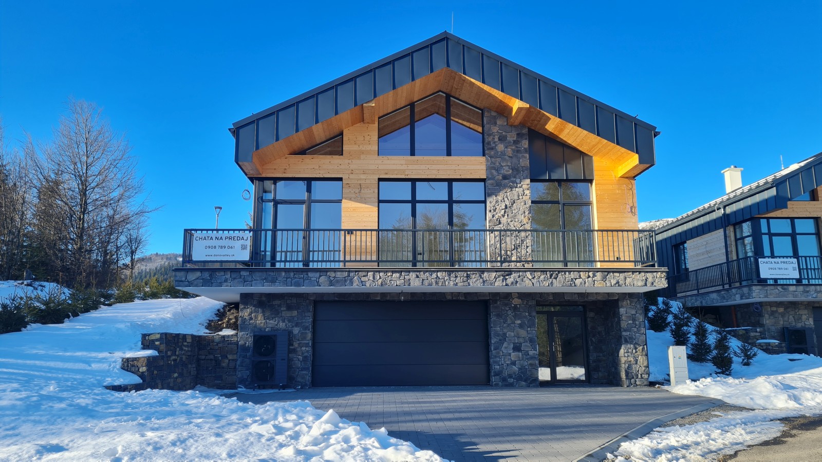 Moderná architektúra chaletového typu kombinuje prírodný kameň, masívne drevo a veľkoformátové presklenie, ktoré prepája interiér s horskou krajinou. Exteriér za domom je kompletne pripravený na inštaláciu vášho súkromného vonkajšieho wellness (príprava na vírivku). Dominantou interiéru je priestranná obývacia hala s vysokým dreveným stropom a veľkými panoramatickými oknami.